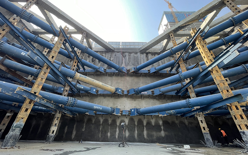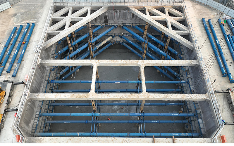 雙層段基坑深度17m,縱向長(zhǎng)度32m,橫向長(zhǎng)度33.8m。深基坑作業(yè)危險(xiǎn)因素眾多,為保障基坑安全開挖,項(xiàng)目在開挖前進(jìn)行多次模擬推演,預(yù)估風(fēng)險(xiǎn)源并不斷優(yōu)化施工方案。開挖過程中遵循時(shí)空效應(yīng),采取“先撐后挖、水平分段、豎向分層”原則,做到“分層、分步、對(duì)稱、平衡、限時(shí)”五個(gè)要點(diǎn),雙層下穿段土方量1.9萬m3,經(jīng)過連續(xù)作業(yè)4月16日完成基坑開挖并通過五方責(zé)任主體單位基坑驗(yàn)槽,4月19日完成墊層混凝土澆筑。